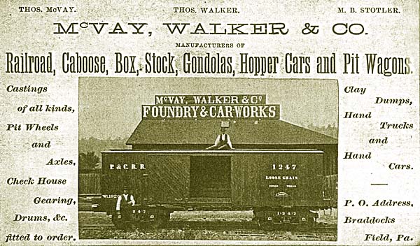 2 After working his way up as an employee, during the time of the Civil War he established a brewery under the name of Fawcett & Walker. However, on the advice of Thomas Marshall, a well known attorney, he withdrew from that line of business. He then established a foundry in 1863 with Thomas McVey at Braddock Field. (Five years later Braddock, PA was incorporated on the site named after the battle where British General Edward Braddock was defeated in 1755 by French and Indian Forces from Fort Duquesne. Fort Duquesne was later defeated by the British, remaned Fort Pitt, and is the location of modern Pittsburgh). The factory was eight miles southwest of downtown Pittsburgh, on the Monongahela River. McVey had invented an automatic railroad dump car, which the firm constructed. Thomas Walker was the company's president.